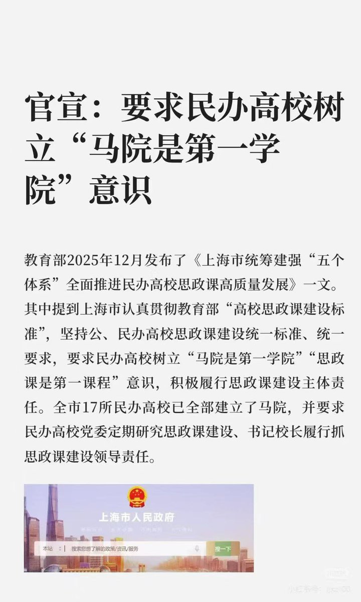 十二年扩张18倍,“第一学院”正在遍布高校 最近,教育部发布的文件中提到:上海市认真贯彻教育部“高校思政课建设标准”要求民办高校树立“马院是第一学院”“思政课是第一课程”意识,积极履行思政课建设主体责任。 根据公开资料,全国高校马克思主义学院的数量在十二年间(2012年至2024年)实现了显著增长。 2012年:全国高校马克思主义学院数量为100余家。 2024年:根据最新统计,全国高校马克思主义学院数量已达到约1929所,较2012年增长超过18倍。