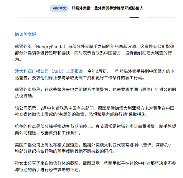 2月27日,据ABC 新闻报道,澳大利亚熊猫外卖春节期间再次发生纠纷,熊猫外卖承认与中国警察联系。