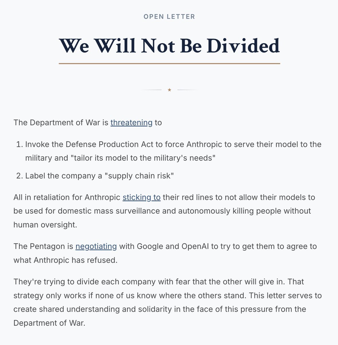 公开信中写道:“五角大楼正在与 Google 和 OpenAI 谈判,试图让它们同意 Anthropic 已经拒绝的条件。他们试图利用‘别的公司会让步’的担忧来各个击破。只有当我们彼此不了解对方立场时,这种策略才会奏效。”