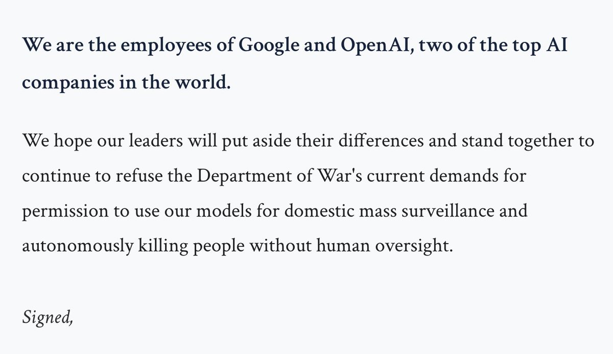 信中呼吁 Google 和 OpenAI 的管理层“放下分歧,共同抵制”五角大楼的要求。