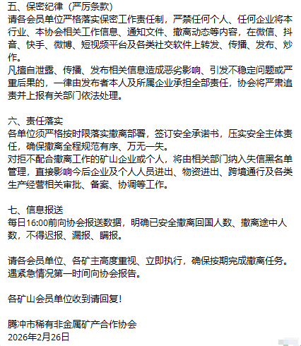 2月26日,腾冲市稀有非金属矿产合作协会发布通知称,针对境外矿山相关情况,已启动人员紧急撤离工作。协会要求各会员单位严格落实保密责任制,严禁任何个人或企业将本行业、本协会相关工作信息、通知文件及撤离动态,通过微信、抖音、快手、微博、短视频平台及各类社交软件进行转发、传播、发布或炒作。