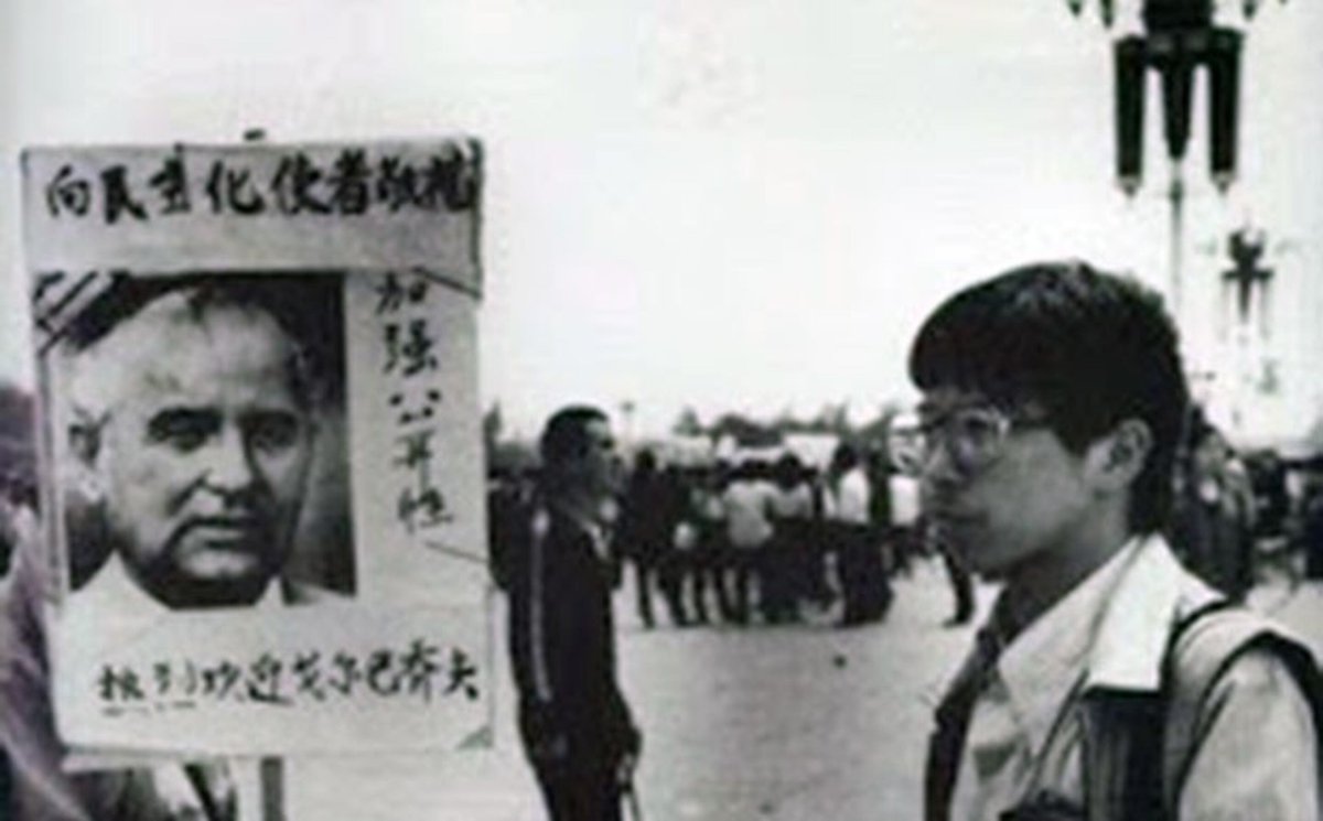 图:1989年5月15日,广场上的学生打出欢迎戈尔巴乔夫的标语。