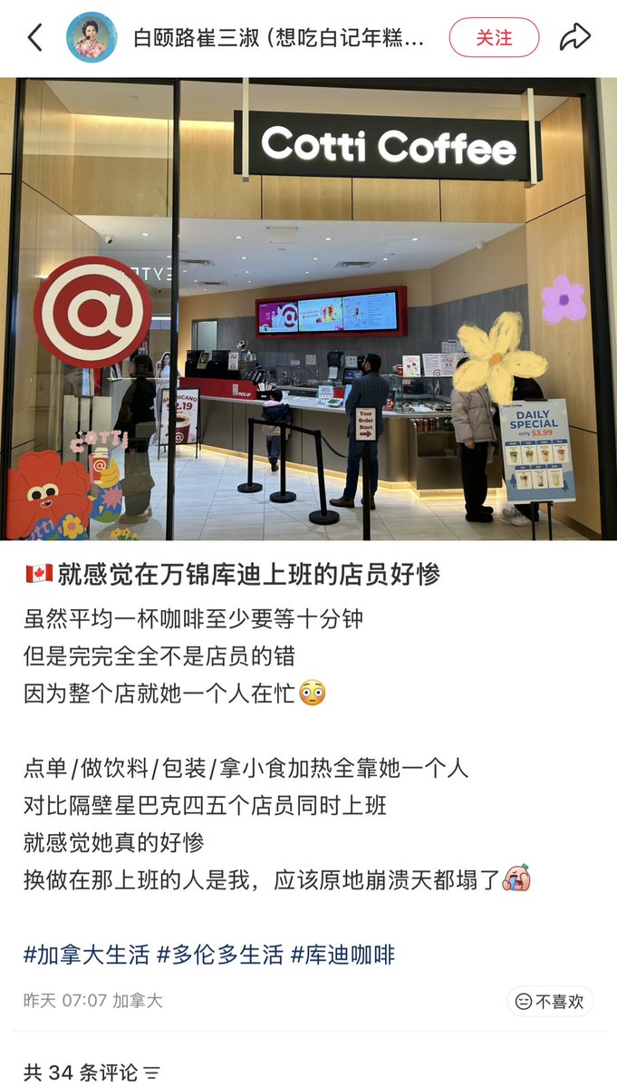 2月26日,一名网友称,加拿大万锦库迪咖啡店只有一名员工,要负责点单、做饮料、包装、拿小事、加热,导致顾客要等很久。