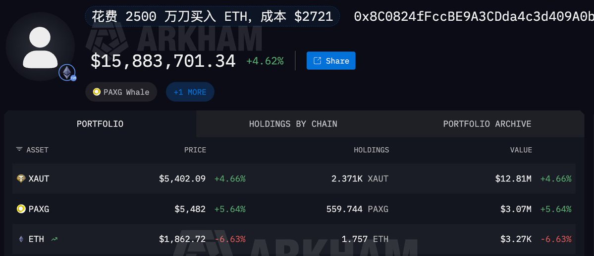 黄金暴涨!2025.10 起分批建仓 1240 万美元数字黄金的巨鲸已浮盈 352.1 万美元🙌