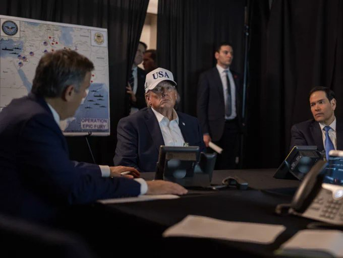 川普与国务卿卢比奥正在观看对伊朗哈梅内伊和伊朗中央常委们斩首的实时画面。