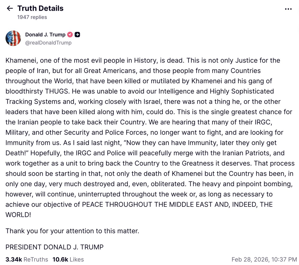 突发!特朗普在truth social上 确认了哈梅内伊的死讯