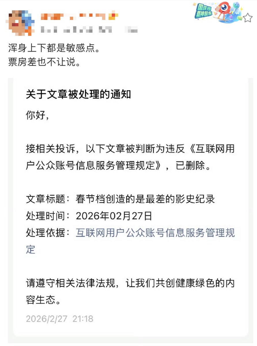 一名博主写了篇题为《春节档创造的是最差的影史记录》文章,随后被平台删除。