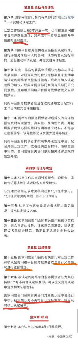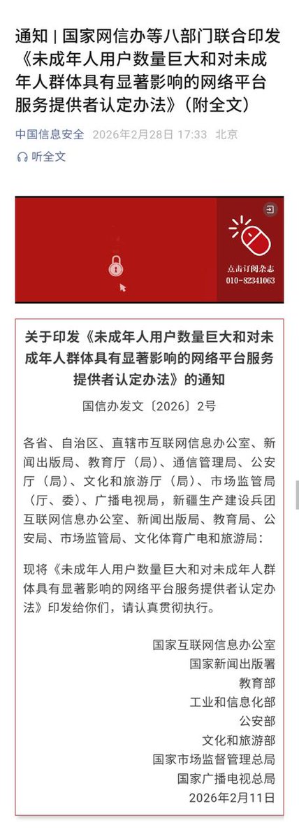 网友投稿:继上个月公安部发布“网络安全防治法”后,网信办今天发布了针对未成年人平台的所谓“用户人数巨大”“有显著影响”的认定标准,以1000万用户和月活跃数100万为下线,强制符合标准的平台“主动认定”,3年开展一次,也适用于用户数突然激增的平台。网信办会对这些认定范围内的平台重点关照,目的是为了杜绝未成年人产生违法违规问题和负面影响。对于不再符合认定标准的,会被移出认定名单。中共的网信办以保护未成年人之名,逼这些平台承担更高主体责任,以强化其审核机制,结果是年轻用户的言论自由的空间被进一步压缩😭
