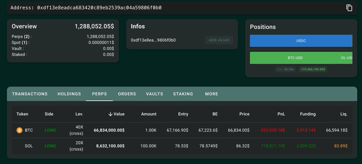 赌战争结束 + 40x 看多杠杆 = 快爆仓了😨 地址 0xdf1…6f0b0 十点半(即官方宣布伊朗最高领袖哈梅内伊遇害后)开启 1000 $BTC 的 40x 多头杠杆(价值 6683 万美元),开仓价 $67167,清算价 $66594,距离清算只有 573 刀的距离了 好在此外他还持有 $SOL 的 20x 多头杠杆,目前浮盈 79 万美元 传送门 👉 https://t.co/t2CK3p8CAV