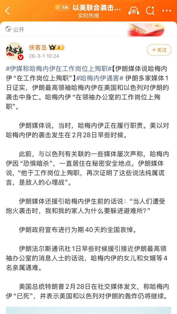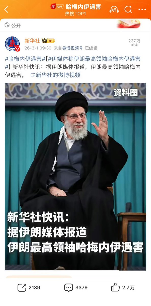 中国媒体报道 哈梅内伊 丧命:最早用「遇害」、然后用「去世」、现在又有了新词「殉职」。