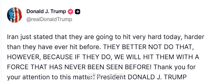 3月1日,特朗普发文:“伊朗刚刚表示他们今天将发起猛烈的行动,力度将比以往任何时候都更加猛烈。他们最好别这么做,因为如果伊朗这样做的话,我们将以前所未见的强大力量予以回击。”