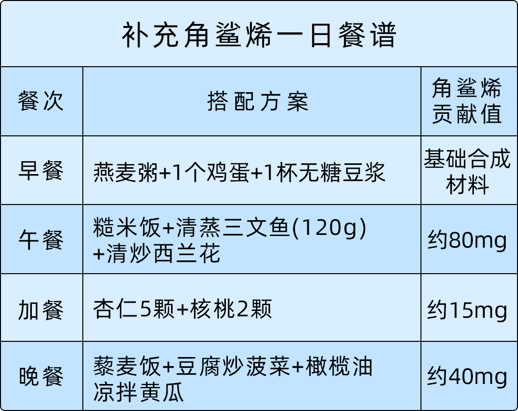 补充角鲨烯:直接摄入富含角鲨烯的食物(如某些深海鱼类),或食用能刺激身体合成角鲨烯的食物。