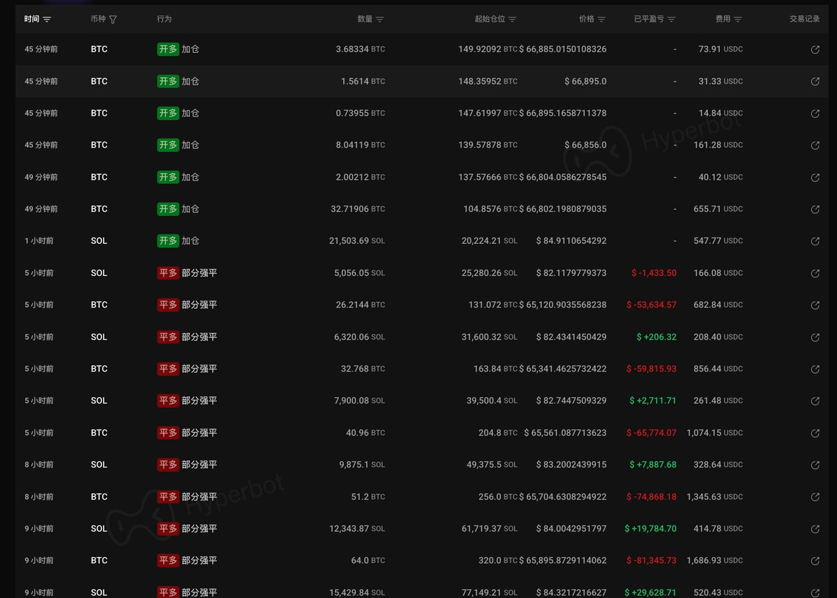 今天凌晨 BTC 一路跌至 $65056,哈梅内伊死亡后 40x 做多 $BTC 的猛士被强平 395.14 BTC 并亏损 52 万美元,7.6 万枚 SOL 盈利 10.1 万美元,不过最近一次清算 $SOL 时也开始亏损了