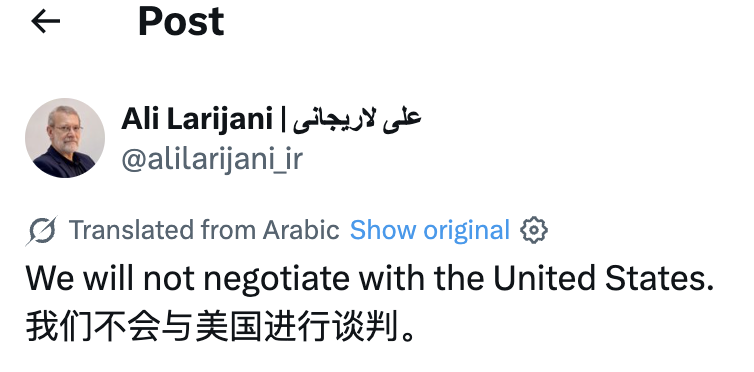 伊朗最高国家安全委员会秘书拉里贾尼说:我们不会与美国进行谈判