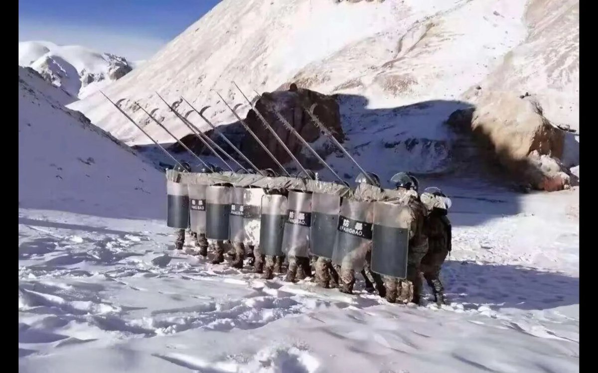 Chinese soldiers training in Phalanx formation near the India-China border. According to the 1996 ageement between the two, Firearms are prohibited within 2 km of the Line of Actual Control(LAC).
