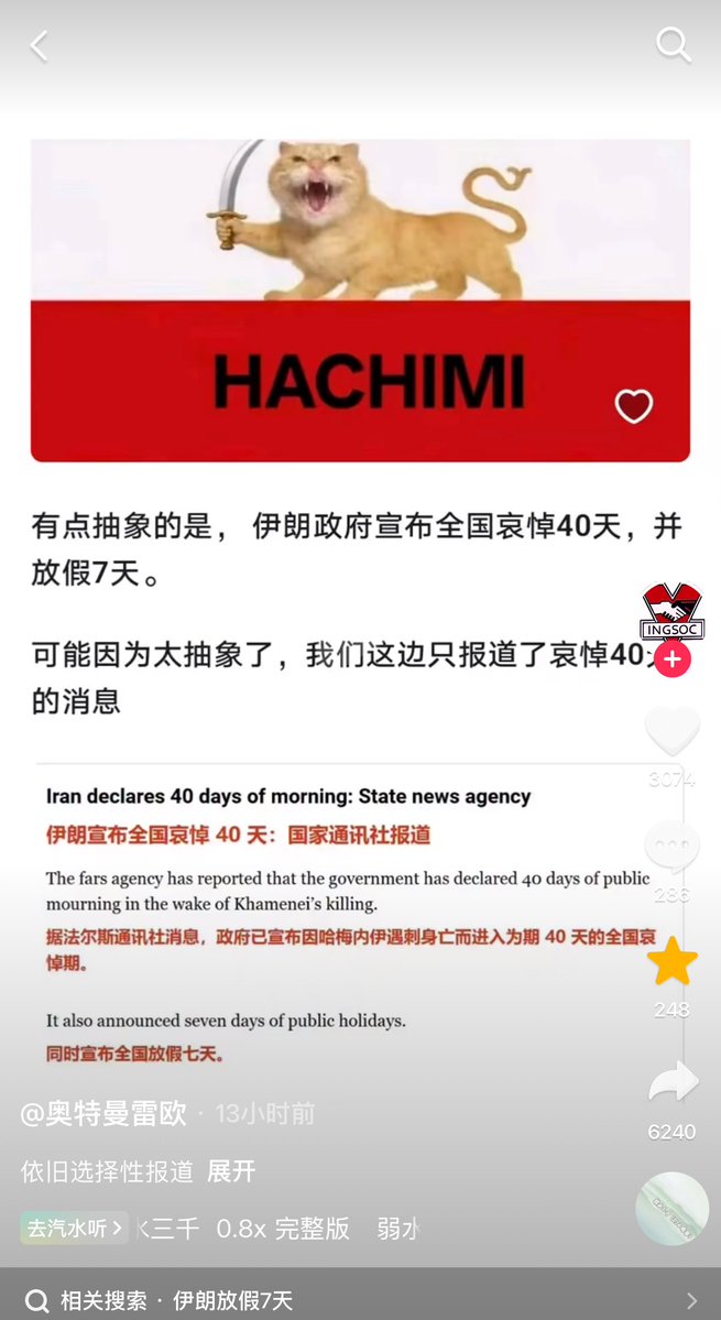 3月1日,有网友表示:有点抽象的是,伊朗政府宣布全国哀悼40天,并放假7天。可能因为太抽象了,我们这边只报道了哀悼40天的消息。