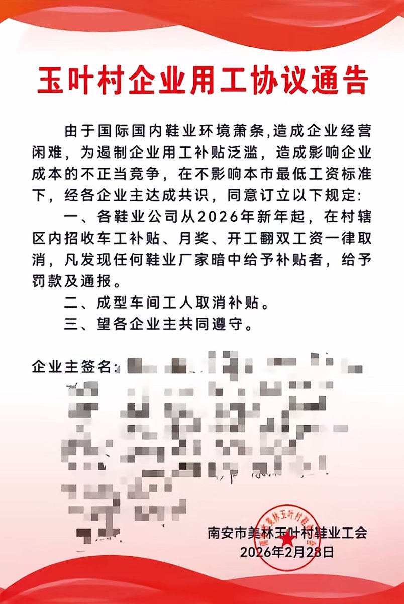 2月28日,福建南安市。网传一则《玉叶村企业用工协议通报》:由于国际国内鞋业环境萧条,造成企业经营闲难,为遏制企业用工补贴泛滥,造成影响企业成本的不正当竞争,在不影响本市最低工资标准下,经各企业主达成共识,同意订立以下规定: