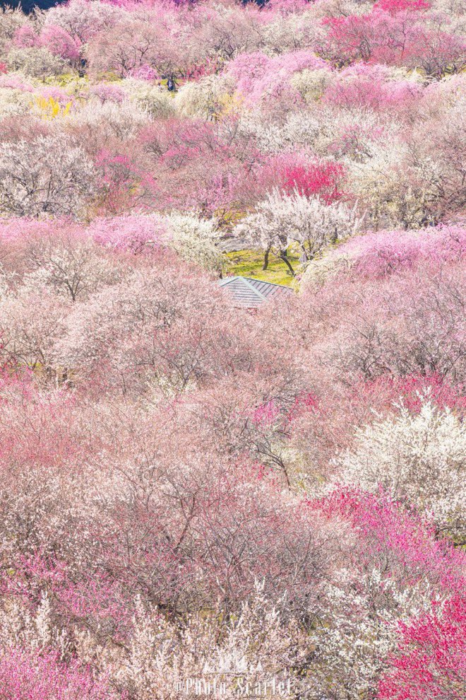 Enchanting plum blossoms blooming in Inabe City Plum Grove Park.