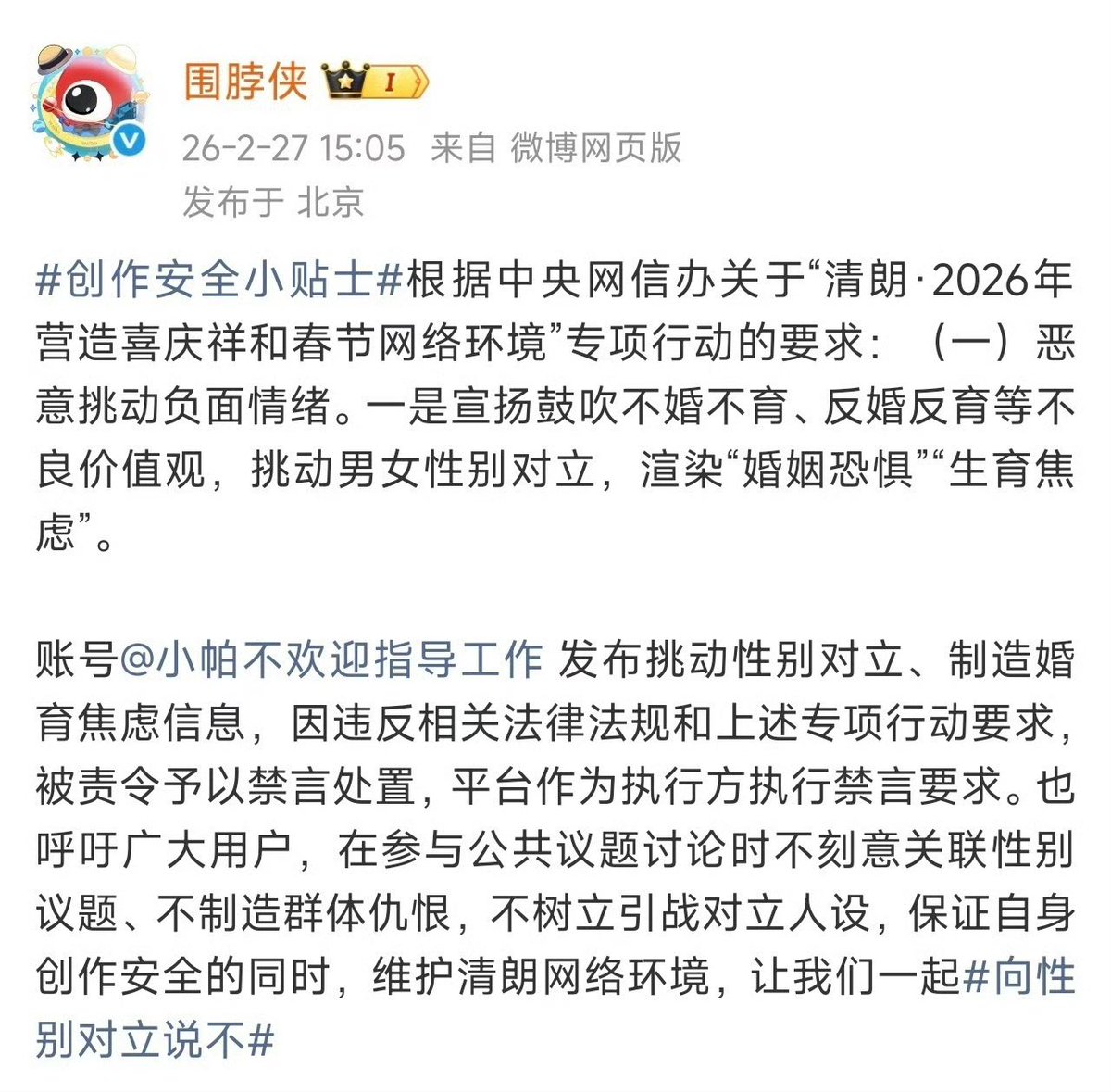 被指“挑动性别对立、渲染婚姻恐惧与生育焦虑、宣扬不婚不育等不良价值观”而炸号