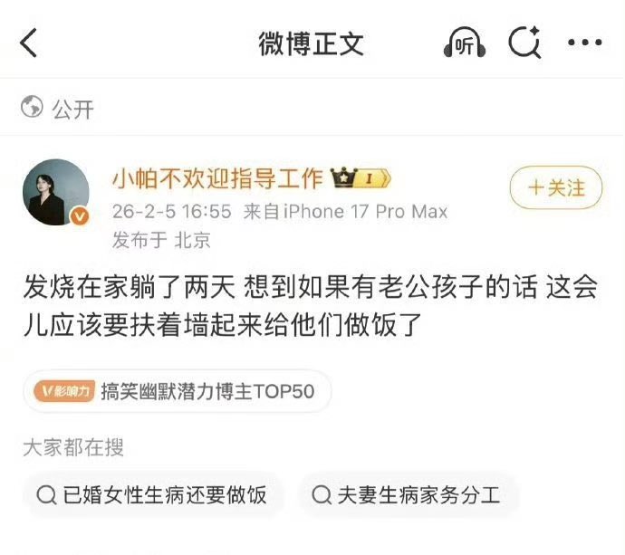 脱口秀演员小帕因为发了一句:“发烧在家躺了两天,想到如果有老公孩子的话,这会儿应该要扶着墙起来给他们做饭了”。