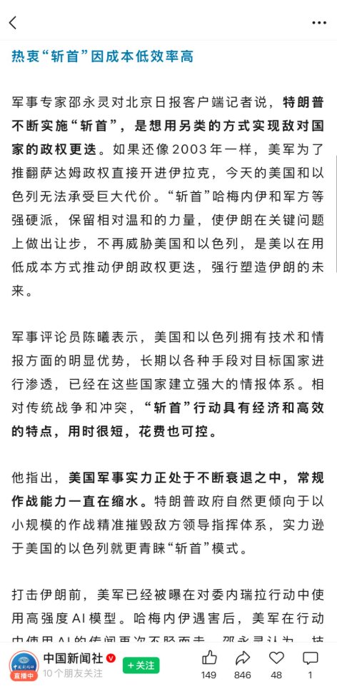3月3日,中国新闻社发文称,从哈马斯,真主党到马杜罗,哈梅内伊...美国热衷于“斩首”战术,是因其军事实力不断衰退,常规作战能力持续缩水导致的。