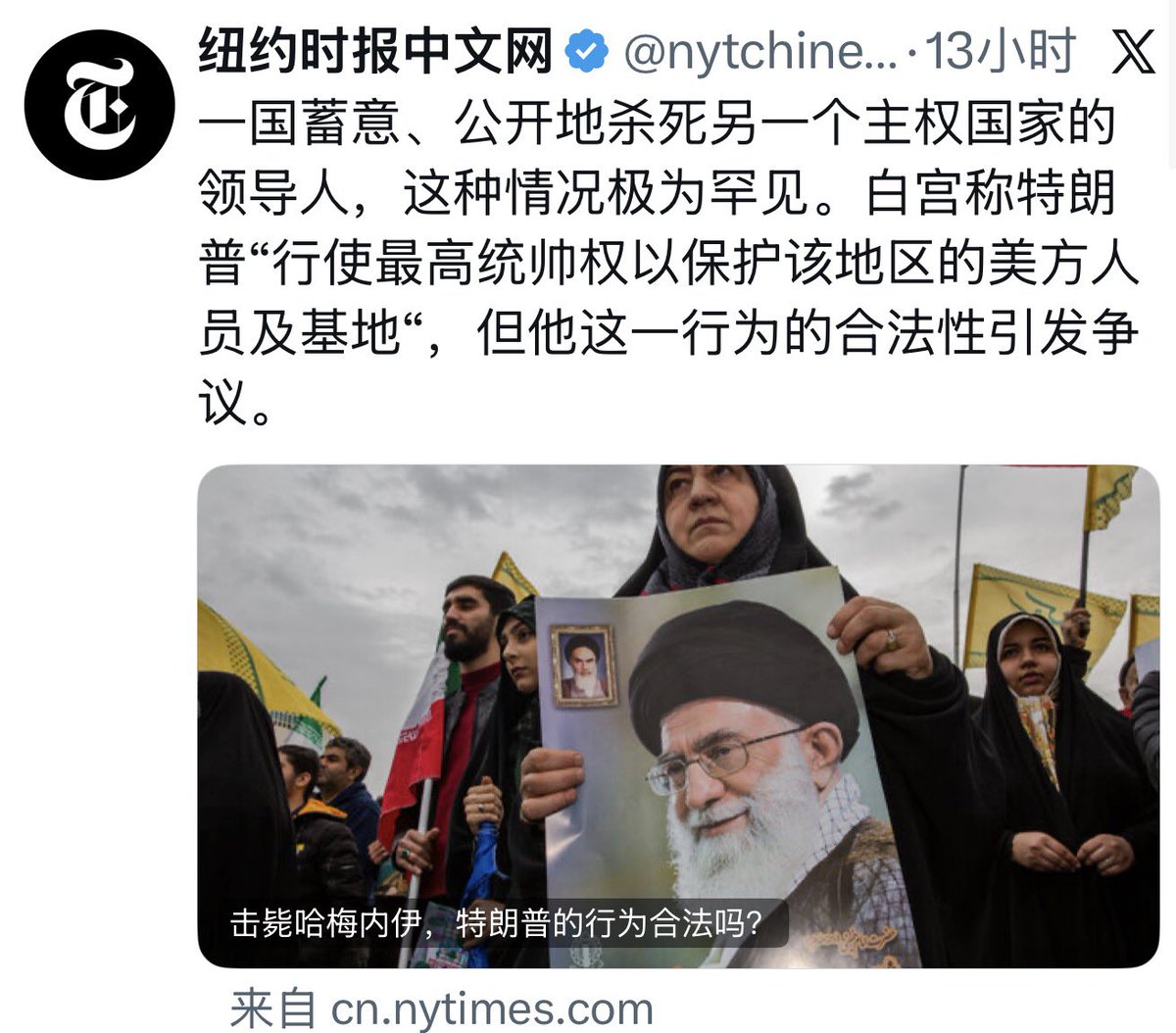 纽约时报中文网,我帮你纠正一个基本政治常识:伊朗这个主权国家的国家领导人,是伊朗人选出来的伊朗总统,他还活着呢!名字,我也帮你找好了,叫做马苏德·佩泽希齐扬。人长这样,我也给你找好了!现在,你们,能不能帮我解释一下?你们口中的,被一国蓄意公开杀死的另一个主权国家的领导人, 又是何许人也?姓甚名谁? 他怎么就成了你们口中的主权国家领导人? 这个主权国家,主,又是谁的主?国,又是谁的国? 你们, 政治常识何在? 现代文明何在? 纽约时报何在?