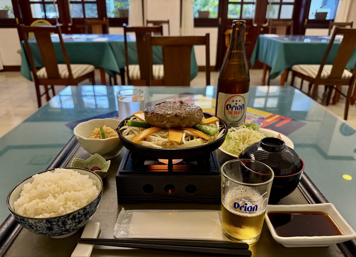 导航说今天爬升2133英尺,相当于650米。出发后最费劲的一天。冲绳的山路就像一位患有bipolar的女友,连绵不断的6-9度坡,骑得让人怀疑人生。但下滑的时候,弯道上时速50公里,又觉得这才是真爱,一切都值得。趁早找旅馆住下,前后30公里都没有吃饭的地方。旅馆的食堂布局像九十年代国内发达地区县城的餐馆。晚餐只有微型铁板烧。看到Burger,加Orion啤酒。又是一天。