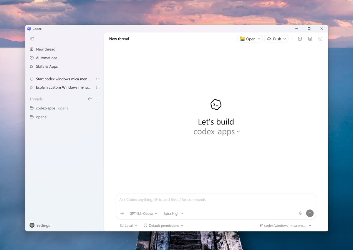 OpenAI 的 Codex App 正式登陆 Windows,支持原生运行,也支持 WSL(Windows 子系统,让 Windows 用户跑 Linux 环境的工具)。终端方面全面兼容 PowerShell、命令提示符、Git Bash 和 WSL,覆盖了大多数 Windows 开发者的日常习惯。