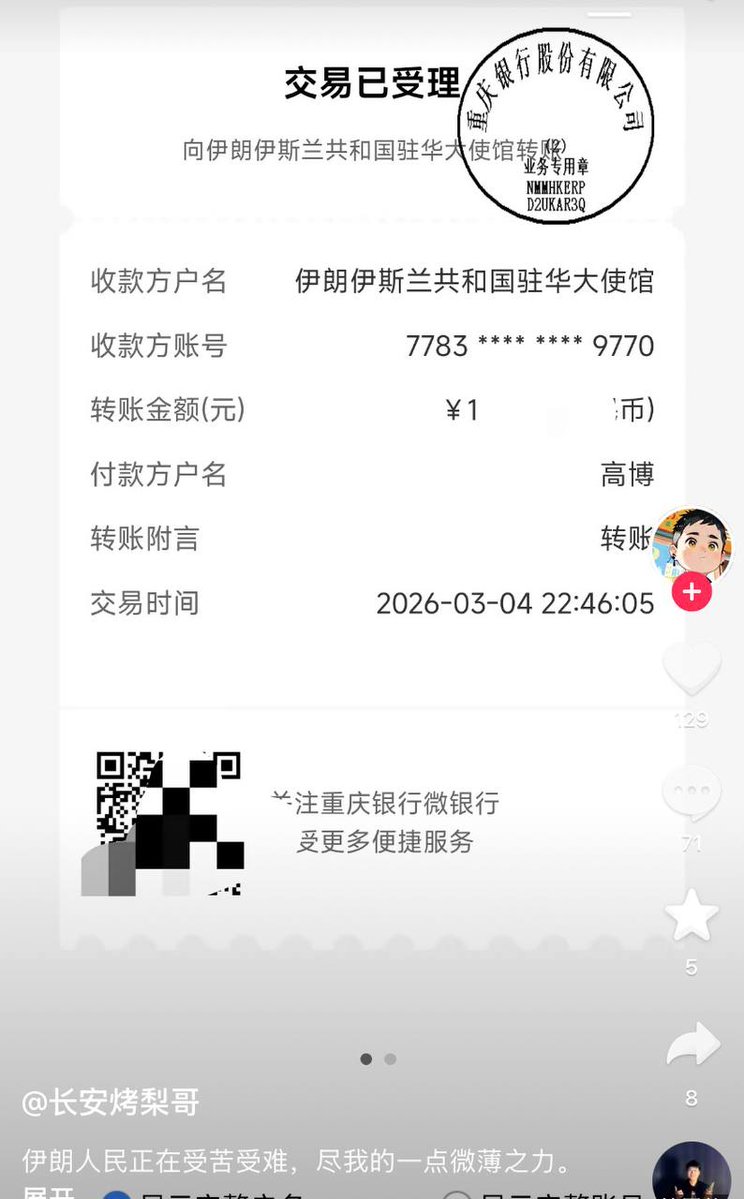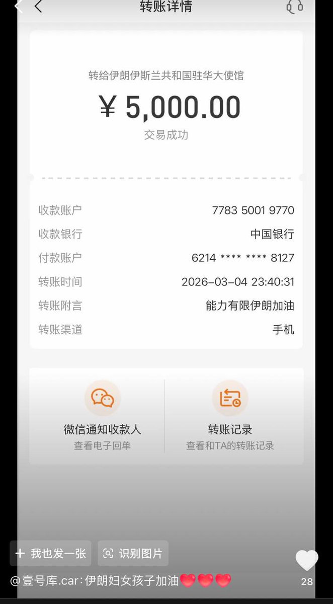网友纷纷晒出向伊朗大使馆捐款的截图 。