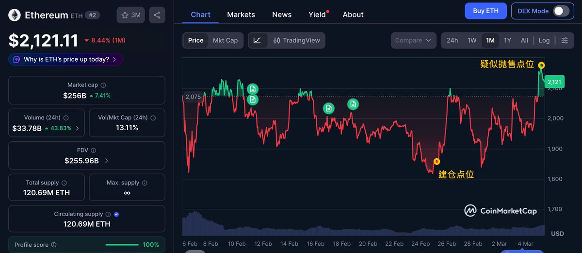 会买也会卖,这位是老师傅啊🫡 波段地址 0xC45…D42DD 02.24 于 $1852.67 从 Binance 提出的 3000 枚 ETH,已在 7 小时前上涨时充值进交易所(几乎是短期最高点),充值价格 $2183,若卖出将获利 99 万美元 时隔一个月终于又看到 2200 刀的 $ETH 了🙌 钱包地址 0xC45A525Be77A208eF610449F30345BA5380D42DD