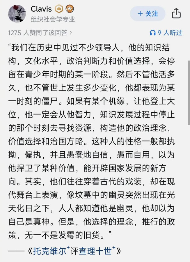 知乎上一个关于哈梅内伊的问题下,一条被删除的节选自《托克维尔评查理十世》的精彩评论。