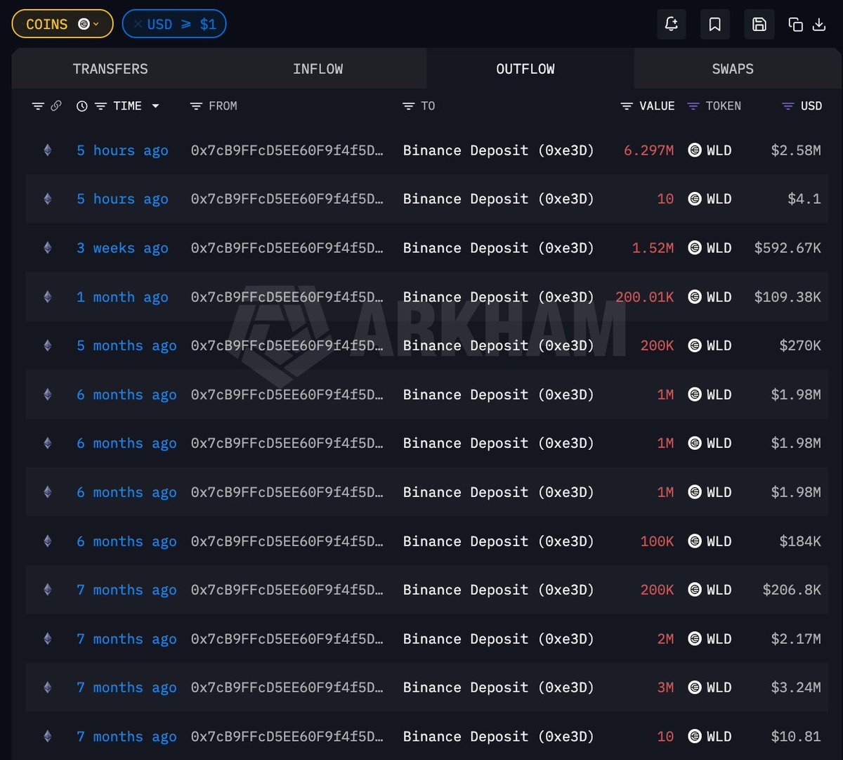 Worldcoin 项目方关联钱包 5 小时前向 #Binance 充值 629 万枚 $WLD ,价值 258 万美元 该地址的资金来源为地址 0xeBC…423DE,再向上追溯则是 WalletSimple(Bitgo) 多签合约,多为资产托管钱包;过去 7 个月已累计向交易所充值 1651 万枚 WLD,总价值 1529 万美元 钱包地址 0x7cB9FFcD5EE60F9f4f5D82Ff1428b4F1f37C73AC