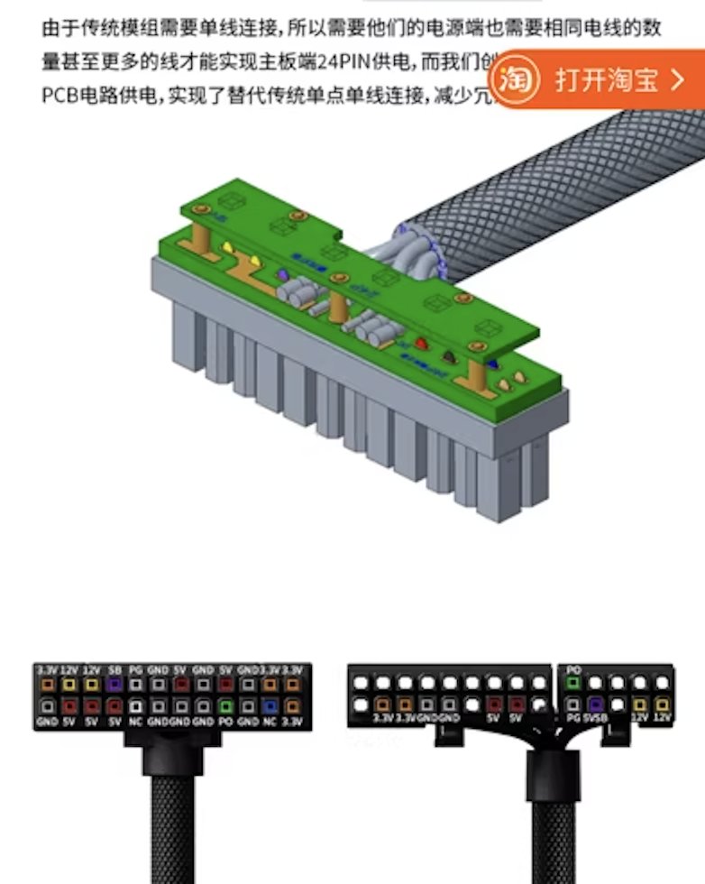 淘宝天天给我推一个 PC 定制电源线,乍一看确实不错,比传统模组线空间占用少了好多。 但我一搜发现就这一家卖类似的产品,总觉得哪不对劲,问了下客服给,客服自豪地表示他们家产品的原理,是把相同电压的导线和 GND 线合并了。 是觉得 ATX 标准制定者是傻子吗,一个 pin 能解决的事情非要用多根线,用着你灵机一动给合并了…