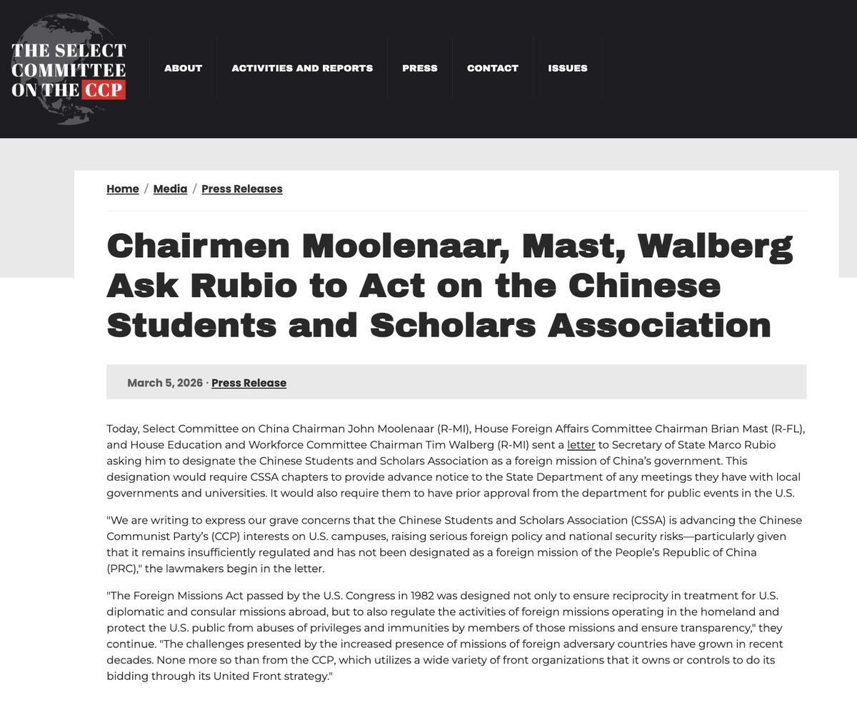 3月5日,美国众议院多名委员会主席致信国务卿鲁比奥,要求将中国学生学者联谊会(CSSA)认定为 中国政府的“外国使团”。