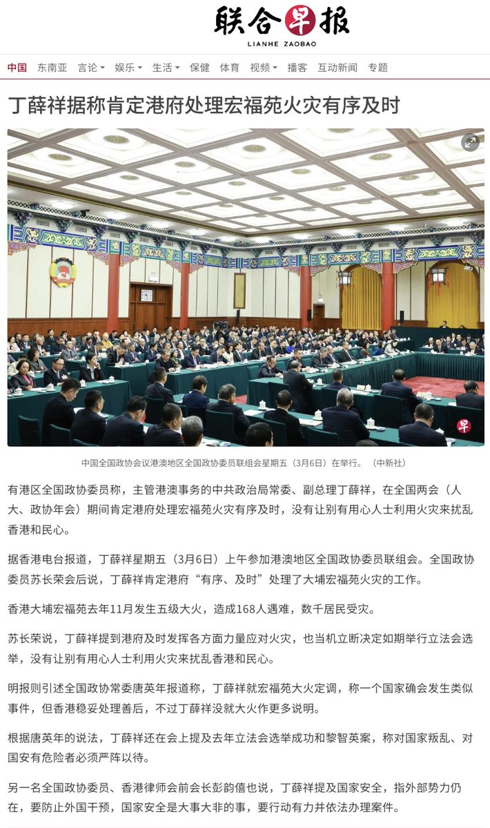 3月6日,联合早报报道,有港区全国政协委员称,主管港澳事务的中共政治局常委、副总理丁薛祥,在全国两会(人大、政协年会)期间肯定港府处理宏福苑火灾有序及时,没有让别有用心人士利用火灾来扰乱香港和民心。