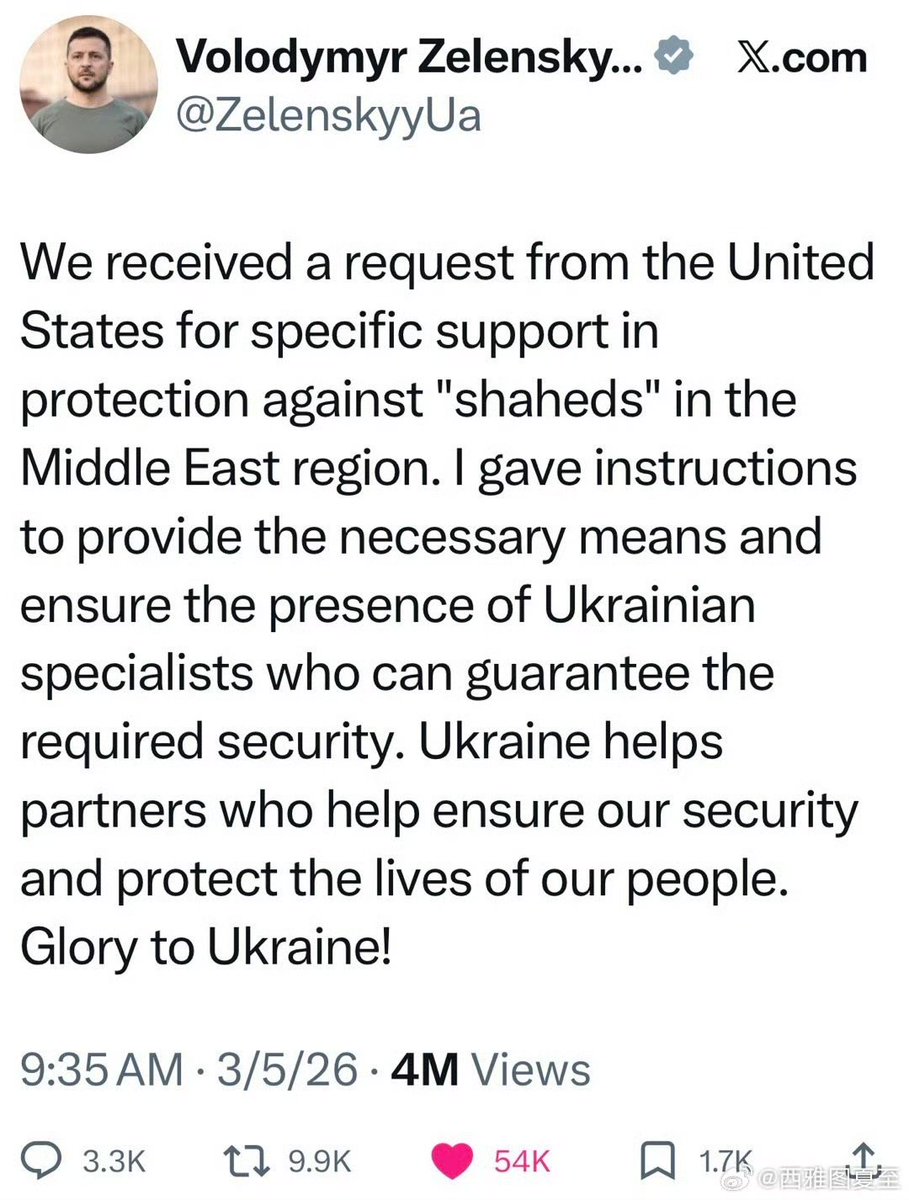 泽连斯基称乌克兰已应美方请求协助中东拦截伊朗无人机 3月5日,泽连斯基表示,乌克兰已收到来自美国方面的请求,希望乌方协助中东地区拦截伊朗制造的无人机。对此,乌克兰方面已派出相关专家,为盟友提供必要支持。 泽连斯基称,乌克兰在应对伊朗“沙赫德”系列无人机方面积累了大量经验,因此能够在技术与战术层面为盟友提供帮助。他表示,乌方已向中东相关地区派遣专家团队,以协助部署和优化无人机拦截与防御体系。