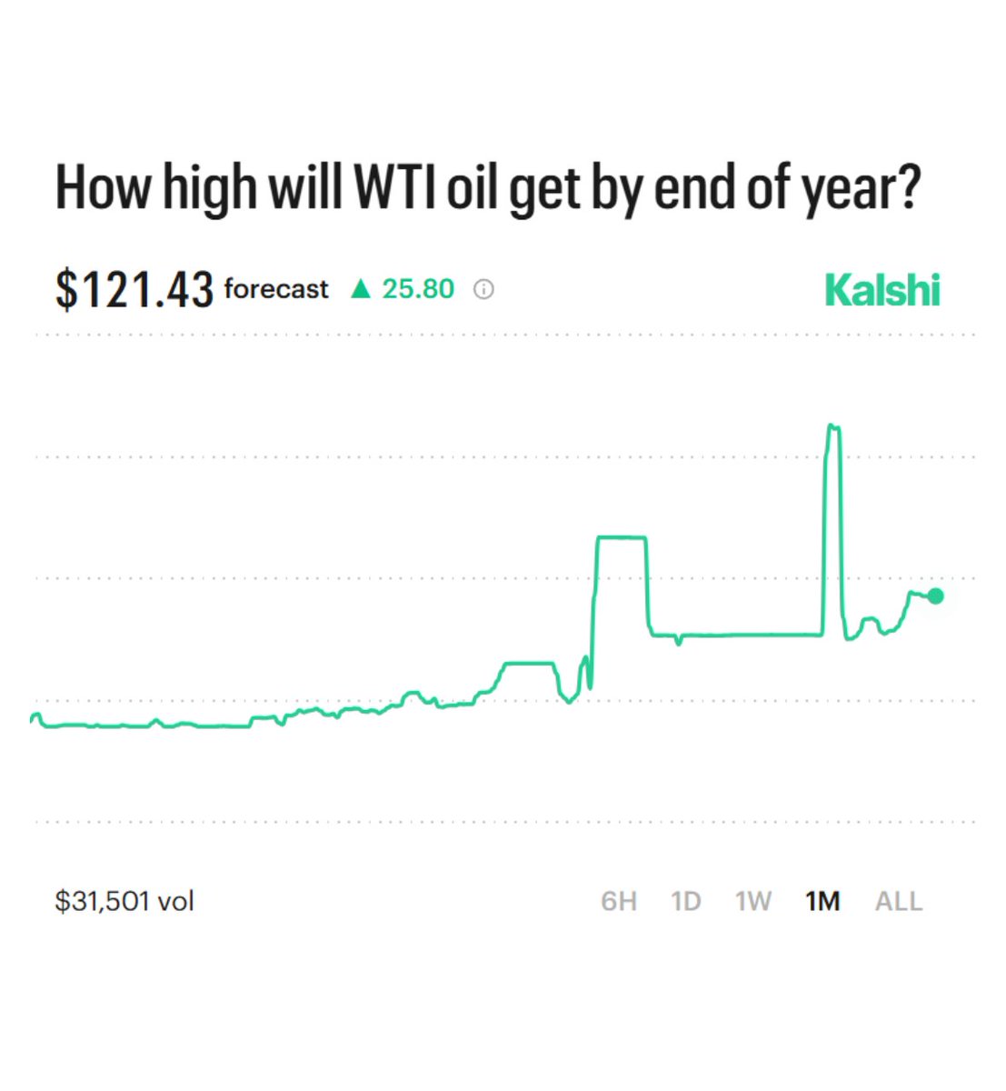 WTI crude oil price forecast to hit as high as $121 by the end of the year, according to prediction market.