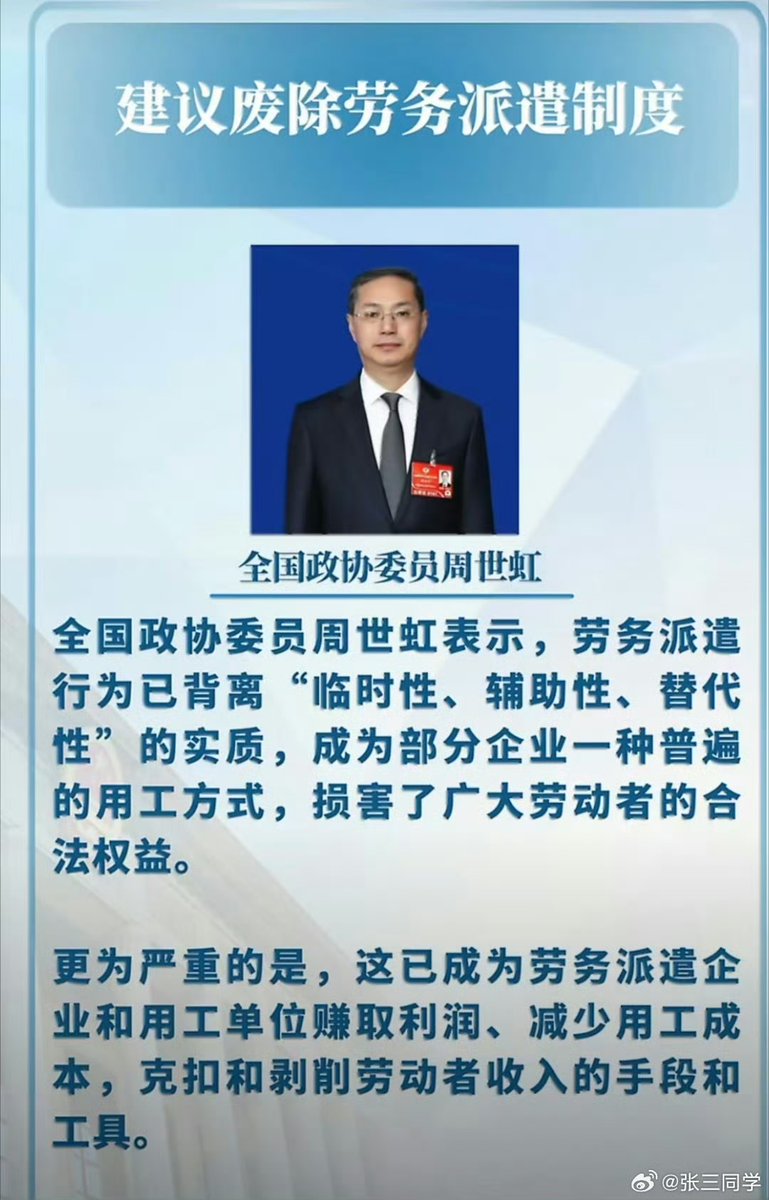 两会快报:全国政协委员周世虹称:建议废除劳务派遣制度。
