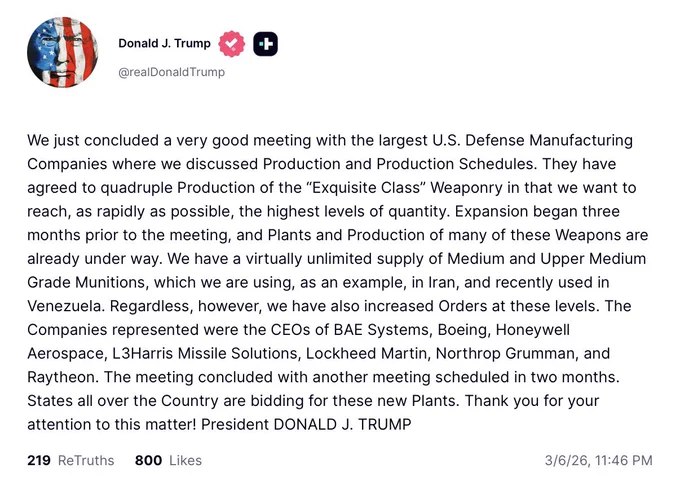 川普表示,他刚刚与美国最大国防制造商举行了一次富有成效的会议,讨论了生产计划与产能安排。