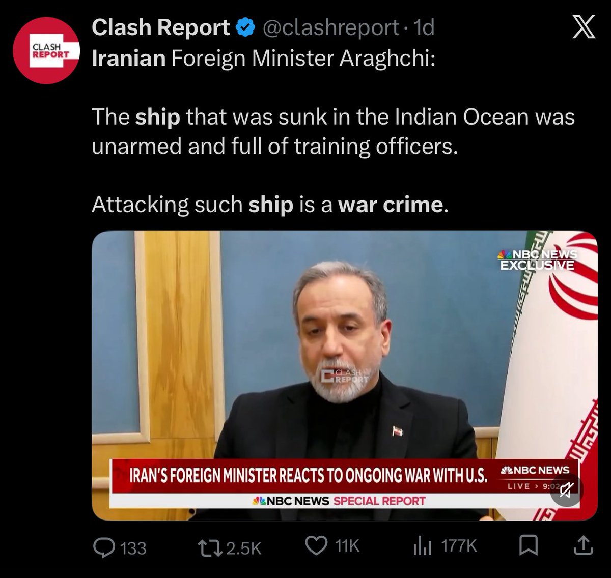 To some people Strikes on civilian ship: not a war crime Iranian warship sunk: war crime However, The Rome Statute of the International Criminal Court defines war crimes. Article 8(2)(b)(ii) War crime includes: “Intentionally directing attacks against civilian objects.” Maybe a lot of people should go back to school. So many uneducated people.