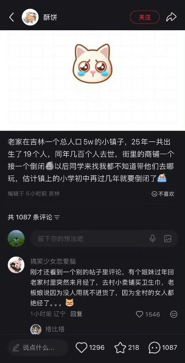 3月6日,一名吉林网友说:老家在吉林一个总人口5w的小镇子,25年一共出生了19个人,同年几百个人去世,街里的商铺一个接一个倒闭,以后同学来找我都不知道带他们去哪玩,估计镇上的小学初中再过几年就要倒闭了。