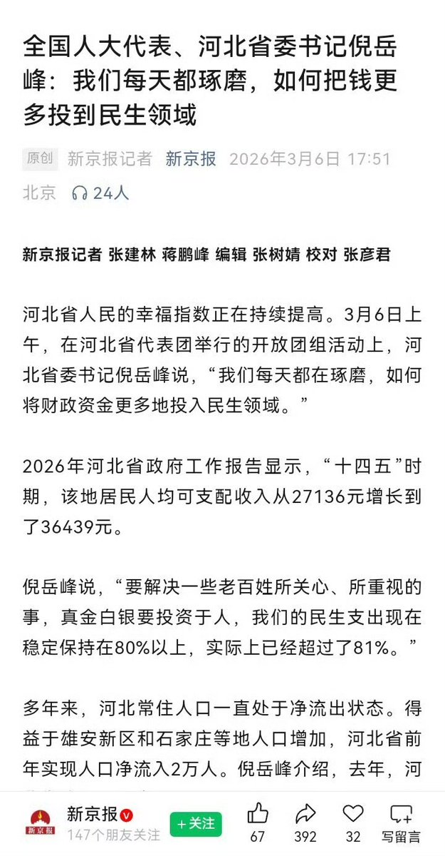 全国人大代表、河北省委书记 倪岳峰表示:“我们每天都在琢磨,如何把钱更多投到民生领域 ”