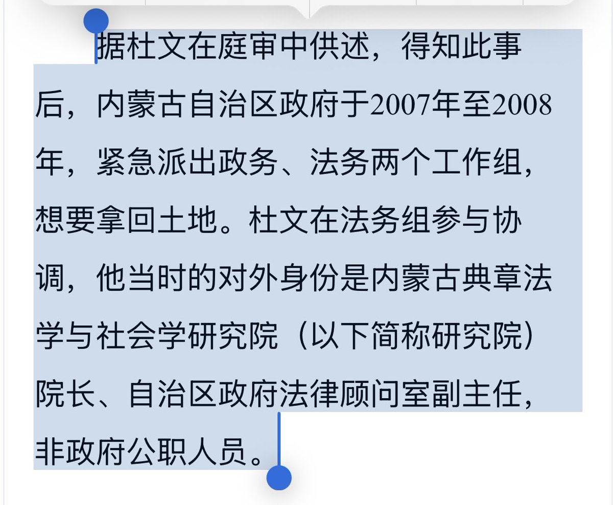 第一,这是杜主任自己的供述,他不是政府公职人员。所以以后不要再拿体制内的身份忽悠别人。第二,作为他们在法制领域的狗腿子,杜先生也是内蒙政府欺压老百姓,制造冤假错案的一份子。他们制造的每一份罪恶,都有你一份贡献。所以,不要装高尚。第三,你现在对中共的谩骂并非因为你有多高的觉悟。只是因为狗咬狗的斗争失败,你才跑出来靠造谣为生。如果没有和武某闹翻,估计你还在内蒙古享受你的狗腿子生活吧。