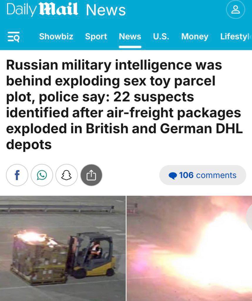 俄羅斯軍事情報部門向英國和德國DHL倉庫寄送了一批藏有燃燒裝置的定時電動性玩具,這些玩具在倉庫內起火燃燒。