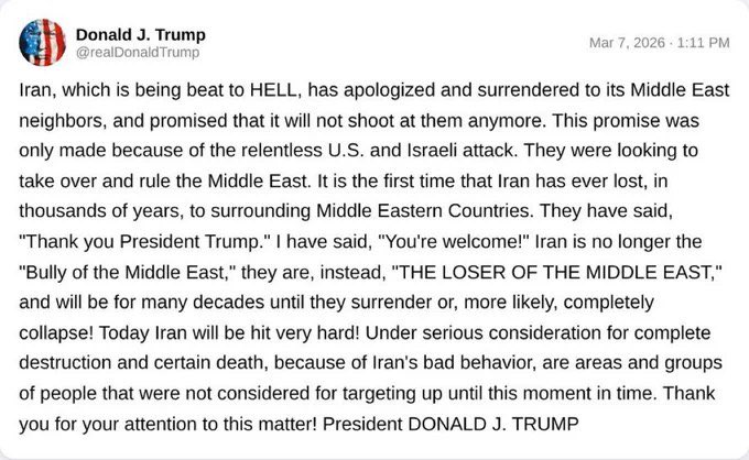 川普发文称,伊朗已彻底战败,实际上正跪地求饶,为其对任何人发动的袭击道歉。