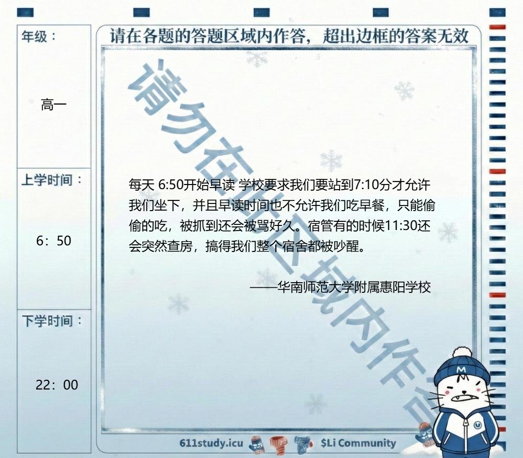 学校规定学生晨读时必须站立20分钟,且早读期间不允许吃早餐。有学生实在饿得难受,只能偷偷的吃,被抓到又会被骂很久。