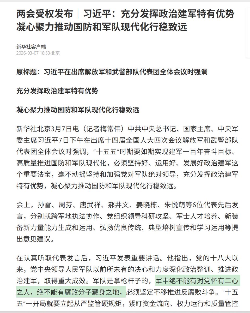 3月7日,习近平强调:军队是拿枪杆子的,军中绝不能有对党怀有二心之人。