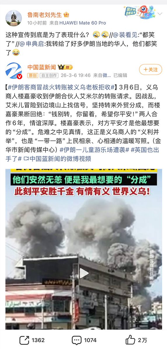 3月6日,据国内媒体报道,义乌商人楼嘉豪收到伊朗合伙人艾米尔的转账请求。因战乱,艾米儿冒险到边境山上找信号,坚持转来外贸分成,而楼嘉豪果断回绝:“钱别转,你留着,希望你平安!”两人合作6年,情谊深厚。楼嘉豪表示,对方平安才是他最想要的“分成”。危难之中见真情,这正是义乌商人的“义利并举”,也是“一带一路”上民相亲、心相通的温暖写照。 网友:我转给了好多伊朗当地的华人,他们看了后都笑了。
