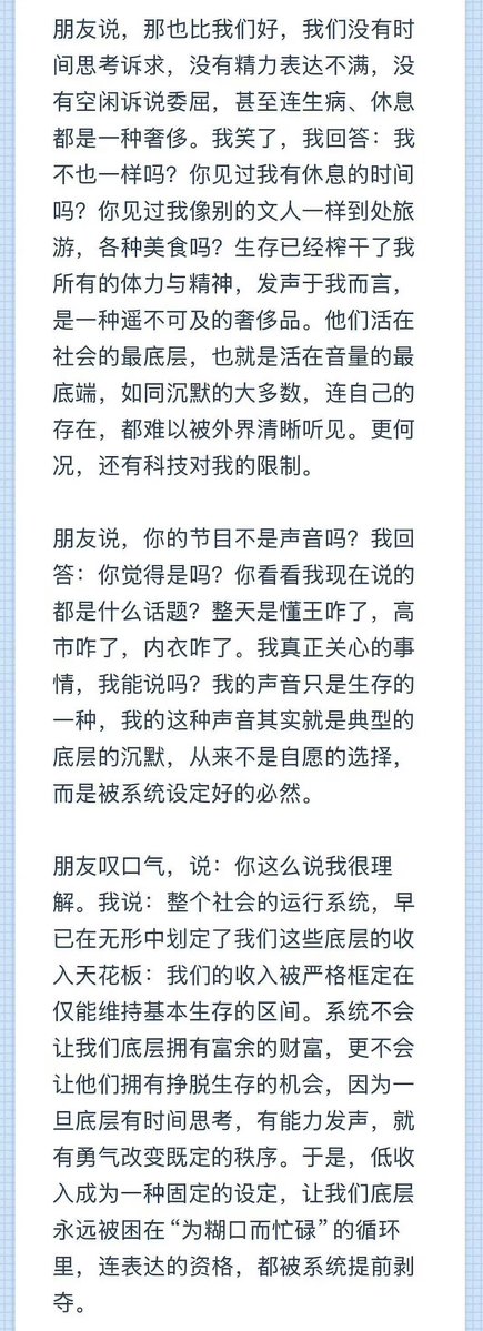 我回答:这是系统决定的,那些清晰且能被听见、能被回应的声音,永远属于拥有时间与一定经济基础的群体;而占据社会大多数的底层,终其一生都在为糊口奔波,连发出自己声音的时间都被生存榨取得一干二净。