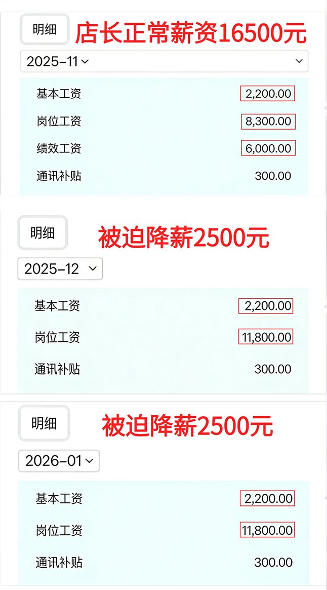 3月6日,湖南长沙一名在西贝工作了15年的店长称,西贝连续数月降薪,其薪资原本为16500元,被降至2500元。 今年1月公司再次要求我降级降薪,我拒绝后,竟然还被克扣2天工资。 店长还称,2011—15年期间,公司不给缴纳社保、2016—2026年期间,公司只按最低基数缴纳,未足额缴纳。 他表示:“我上有老,下有小,每月还要还房贷,养孩子,我不求特殊照顾,只求依法补偿、公平公正”